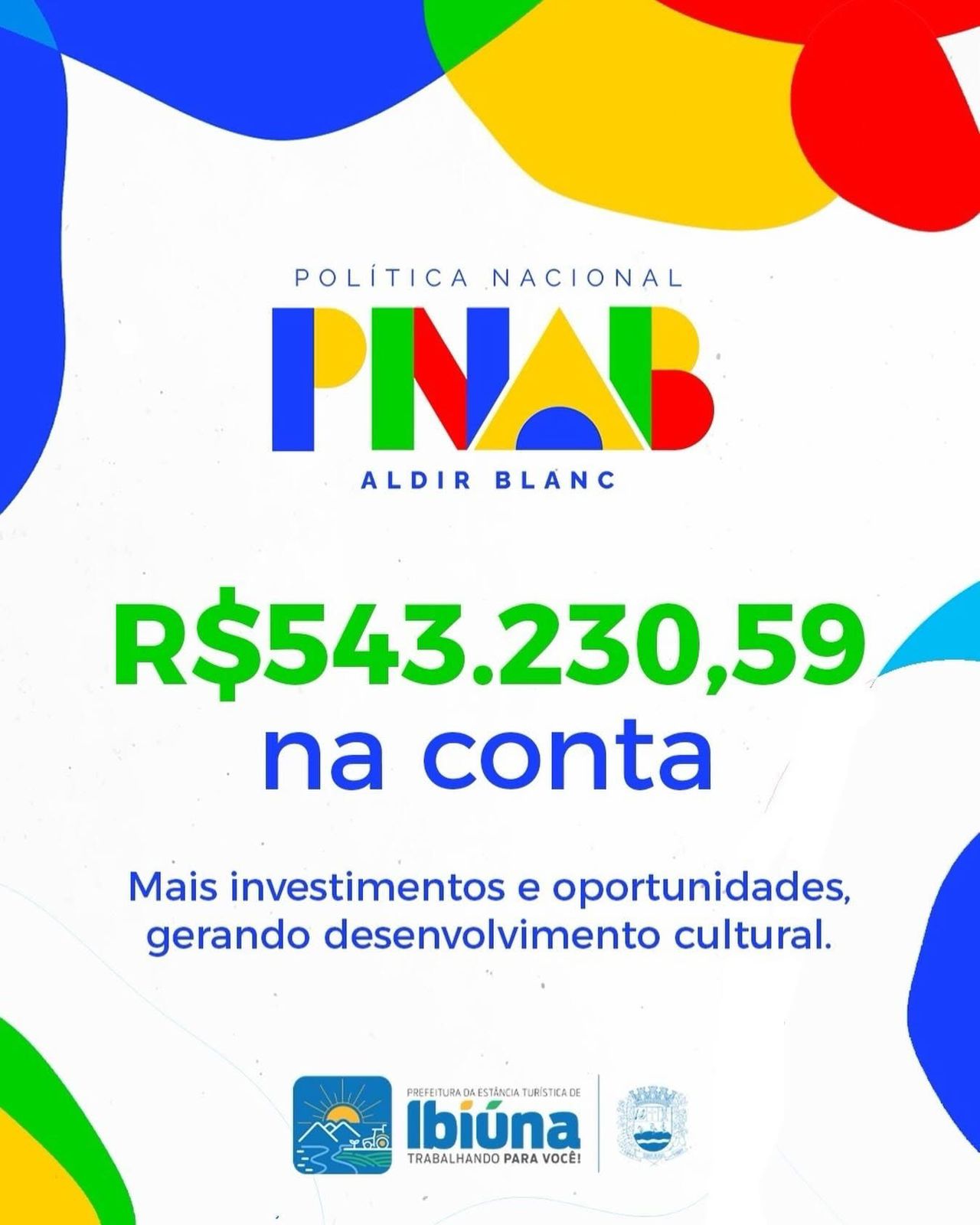 O recurso da Política Nacional Aldir Blanc já está na conta: são R$ 543.230,59 destinados para fortalecer ações culturais em nosso município. 🎭✨